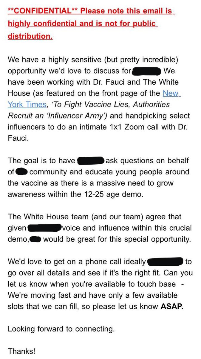 NEW: I’ve obtained the *Confidential* White House PR email sent to TikTok influencers begging them to “do an intimate” zoom call with Dr. Fauci. The goal is to influence children as young as 12. How much did the White House pay for this cringe video?pic.twitter.com/OApHdHf5iR