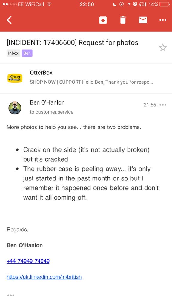 @OtterBox @OtterBox_UK I've had my otterbox case less than two months and the rubber on the back is peeling + the arm is cracked. Pls help?