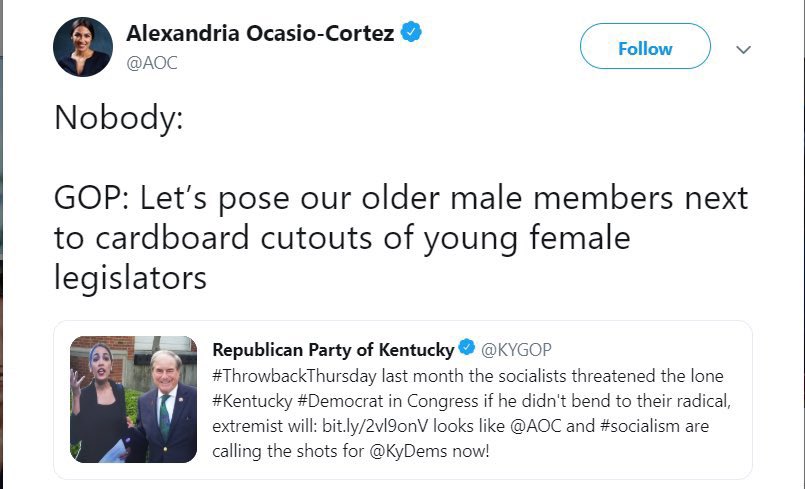 Actually, the GOP doesn't care. One twitter user whose account has since been deleted cared; people across the political spectrum made fun of him.https://twitter.com/AOC/status/1081234130841600000 …