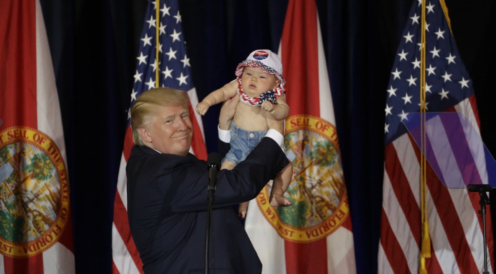 he is pain hoisting the baby up, with a toothless smile. GOP = Grand Obstruction Party or Grab Our P###y #HelpUs