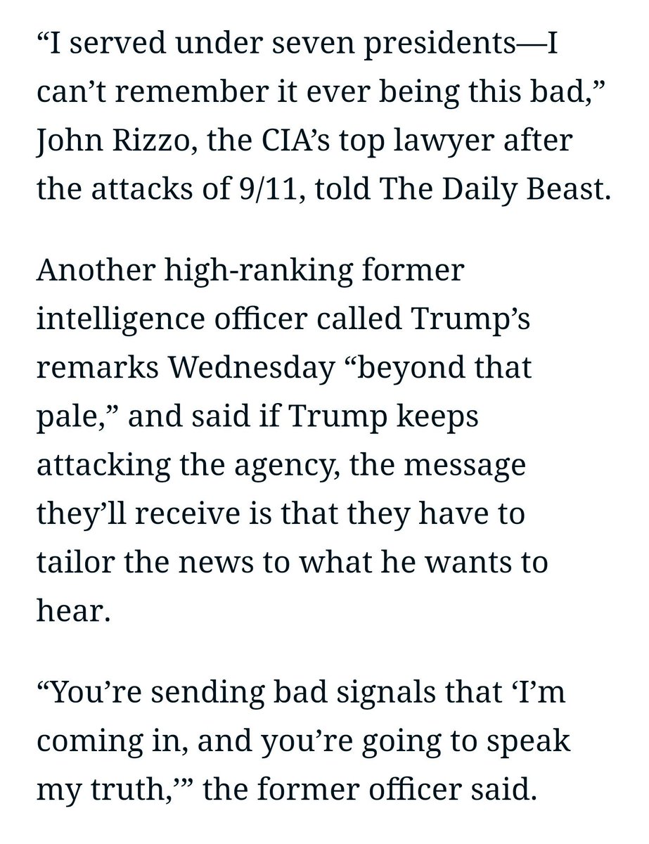 Intelligence veterans say relations with a president have NEVER been this bad. http://www.thedailybeast.com/articles/2017/01/11/u-s-spies-to-trump-stop-comparing-us-to-nazis.html …pic.twitter.com/e7Nbp30bcU