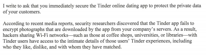Episode 2 in @RonWyden's Latest Effort to Fix Cyber Insecurity: In which Sen. Wyden calls out @Tinder for failing to encrypt its users' photos when downloaded from the server. If these reports are true, this is a pretty basic security mistake. https://www.wyden.senate.gov/imo/media/doc/Letter%20to%20Tinder%20on%20Cybersecurity.pdf …pic.twitter.com/PyciN8LQKS