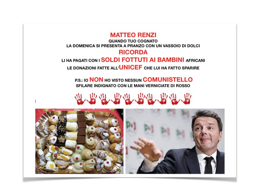 IO NON DIMENTICO. Io non ho sentito nessun COMUNISTA indignarsi. Io non ho sentito nessun COMUNISTA chiedere di restituire i soldi rubati ai bambini. Io non ho visto nessun COMUNISTA sfilare con le mani verniciate di rosso. COMUNISTI, PUAH.pic.twitter.com/rvSibWCUMu