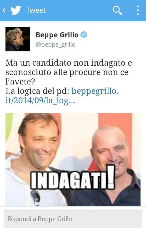 @beppe_grillo: Ma un candidato non indagato e sconosciuto alle procure non ce l’avete?#PD http://www.beppegrillo.it/2014/09/la_logica_del_pd.html … pic.twitter.com/rxzcbw6RTh”This media may contain sensitive material. Learn more