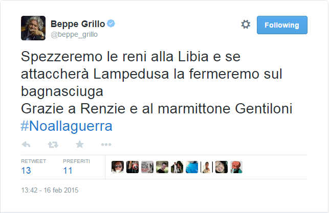 .@beppe_grillo, capo politico del M5S (9 milioni di voti, 109 deputati e 54 senatori), su Libia e ISIS.