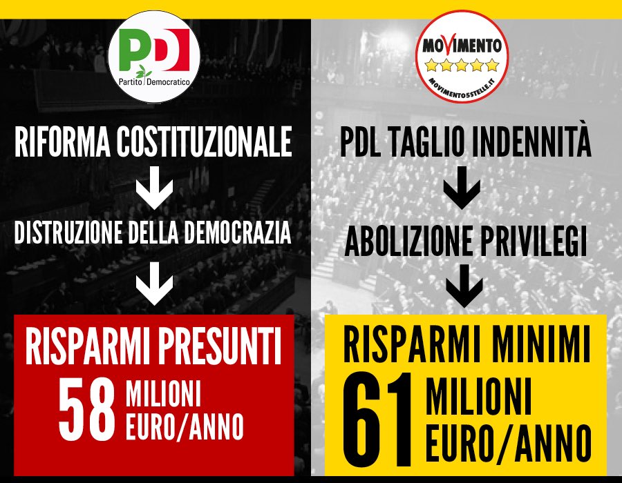 dimezziamo anche il numero 300 deputati e 150 senatori contributi come normali statali divieto cumulo... Questo è' risparmio!