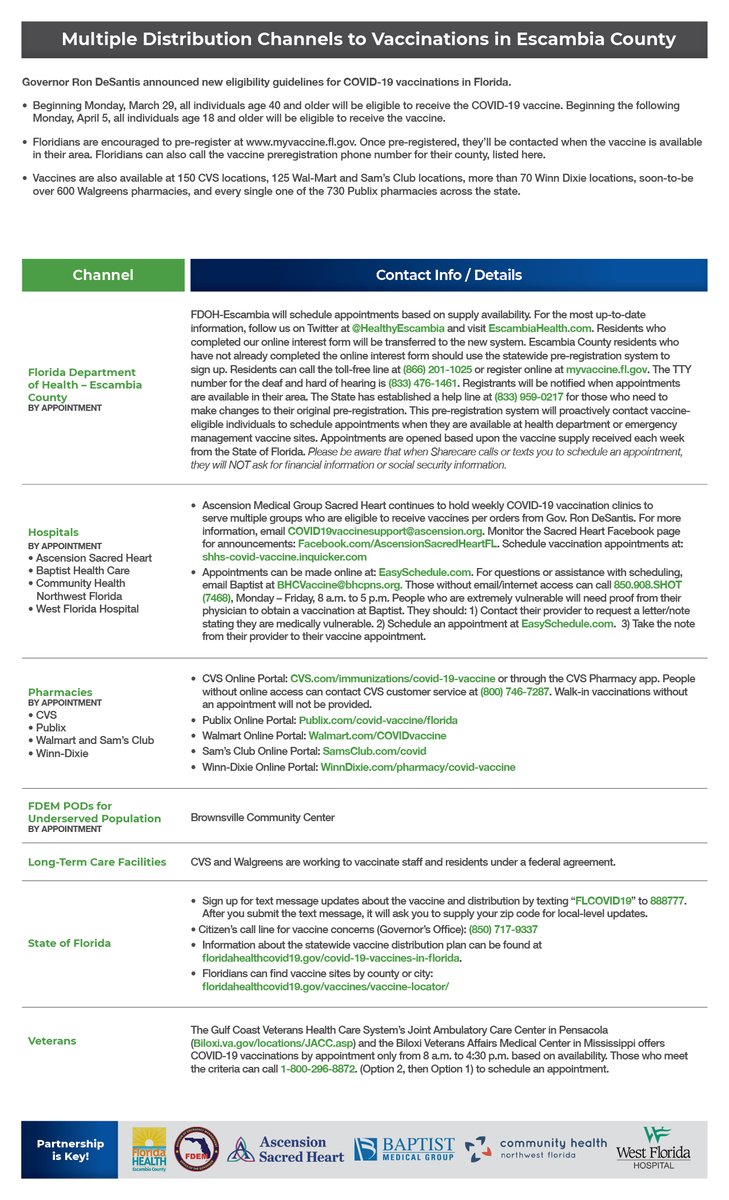 Starting today, all individuals age 40+ are eligible to receive COVID-19 vaccine in Florida. Preregister for an appointment at http://myvaccine.fl.gov and view this week's COVID-19 vaccine distribution plan in Escambia County: https://bit.ly/3flVni8