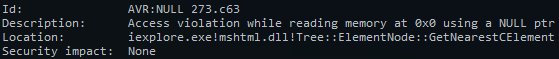 #DailyBug bonus #MSIE NULL pointer <body id="m" xmlns="http://www.w3.org/1999/xhtml " onload="m.id='x'"><style> (1/2)pic.twitter.com/c7R3PTiXOh