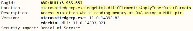 https://github.com/SkyLined/Bugs/blob/master/2016-10-21%233%20AVR%D6%89NULL%2BN%20983.653%20%40%20microsoftedgecp.exe!edgehtml.dll!CElement%D6%89%D6%89ApplyInnerOuterFormats/repro.html …