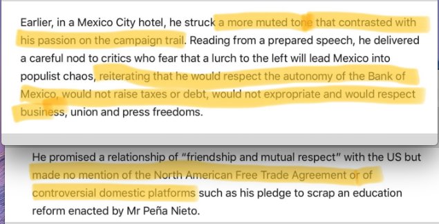 My concern, simply put, is that #AMLO will pull an Obama or a Lula, in the sense that he'll betray his rhetoric of change by carrying out a policy agenda effectively of continuity