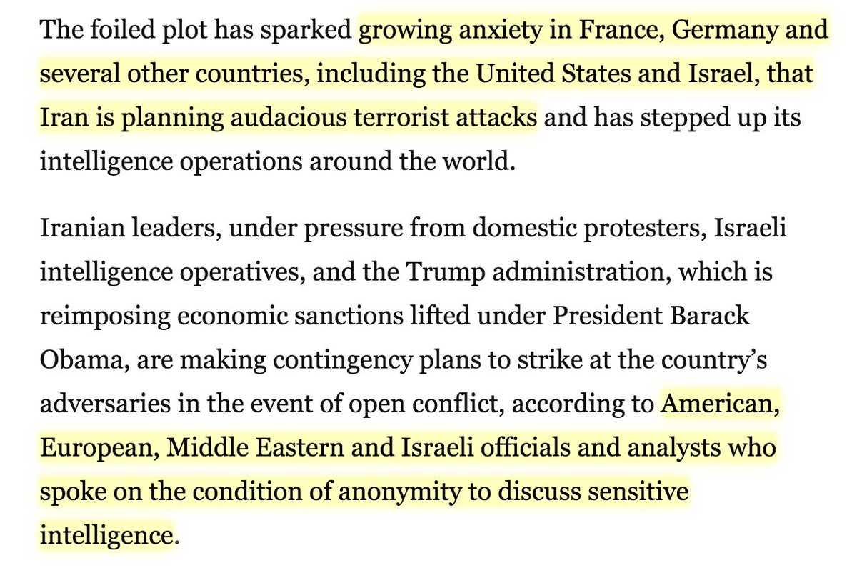 The Washington Post publishes a report warning of "growing anxiety... that Iran is planning audacious terrorist attacks," around the world. Cites anonymous "American, European, Middle Eastern and Israeli officials and analysts." https://www.washingtonpost.com/world/national-security/foiled-paris-bomb-plot-raises-fears-that-iran-is-planning-attacks-in-europe/2018/10/11/2ccf8d0a-c8b9-11e8-b1ed-1d2d65b86d0c_story.html?utm_term=.0e8f6b91b1a1 … pic.twitter.com/0COJQaUY2N