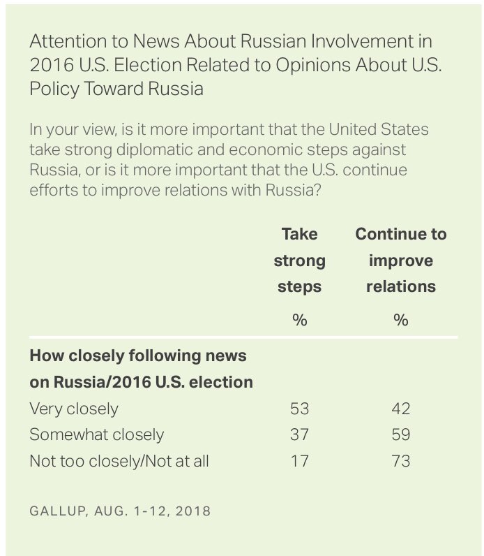 Interestingly, this new Gallup poll indicates that the more one is exposed to the highly propagandized media coverage of Russiagate, the more hostile towards Russia one becomes https://news.gallup.com/poll/241124/favor-diplomacy-sanctions-russia.aspx …pic.twitter.com/xsnpxk5UvJ