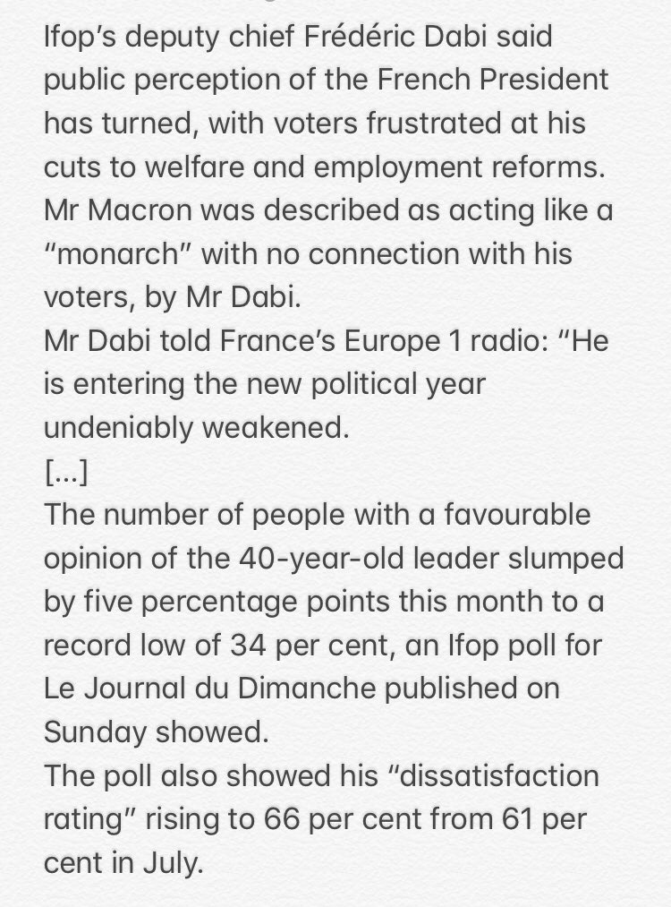 @EmmanuelMacron reached a record high in July 2018: 59% of people polled disapproved of him.@IfopOpinion’s deputy chief Frédéric Dabi said: “This is his highest disapproval rating yet… His popularity is eroding”https://www.express.co.uk/news/world/984549/emmanuel-macron-poll-ratings-france-latest …2 replies 4 retweets 2 likesShow this thread -