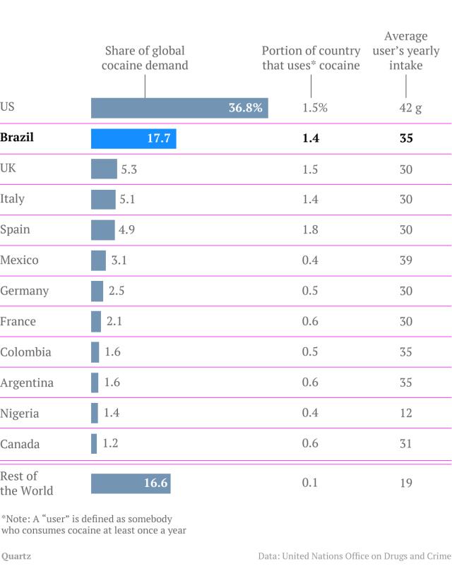 Share of global cocaine demand US - 36.8% Brazil - 17.7% UK - 5.3% Italy - 5.1% Spain - 4.9% Mexico - 3.1%pic.twitter.com/WJZBuTZYx4