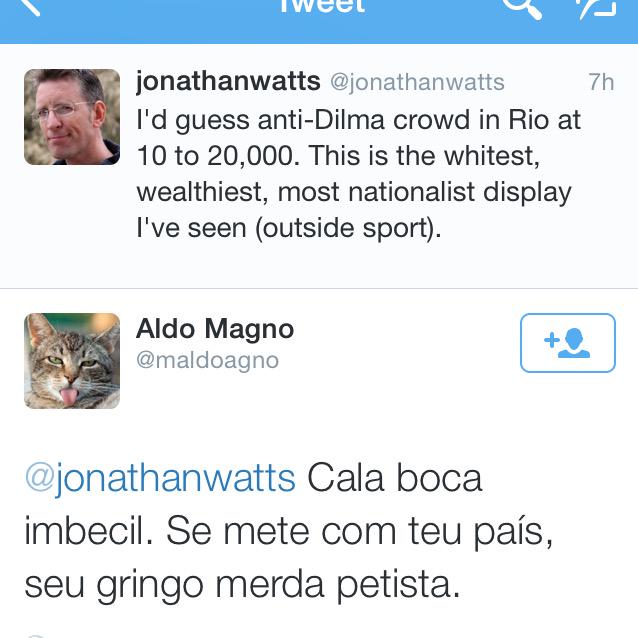 And a tweet to @jonathanwatts shows that the Brazilian Right knows how to keep it classy https://twitter.com/maldoagno/status/577128526521987072 …pic.twitter.com/Peby2Nz4GQ