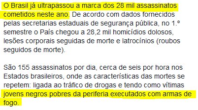 "28 mil assassinatos" em 2017, maioria das "vítimas jovens negros pobres da periferia executados com armas de fogo" http://brasil.estadao.com.br/noticias/geral,brasil-registra-28-mil-homicidios-no-1-semestre,70001943908 …pic.twitter.com/nFbtFfKuTw