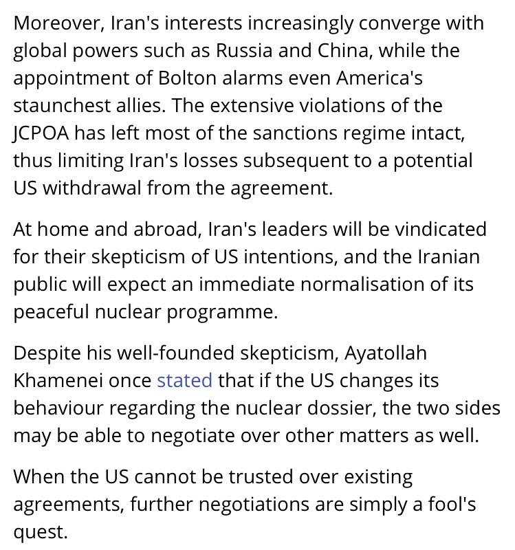 Very good thread on how US policy towards Iran is totally senseless, counterproductive, hubristic and smacks of desperationhttps://twitter.com/sinatoossi/status/1059835081198616577?s=21 …