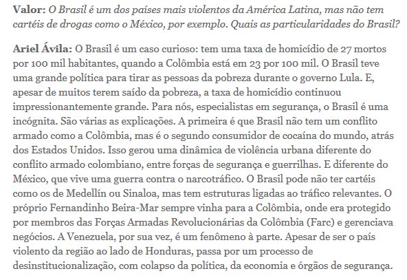 muito interessante essa curta entrevista com @ArielAnaliza, sobre a violência no Brasil vista no contexto regional http://www.valor.com.br/politica/5329415/modelo-brasileiro-de-seguranca-favorece-corrupcao …pic.twitter.com/x6QsY6VIlw