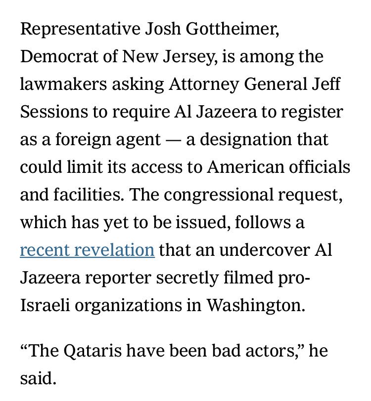 Maybe I missed it, but other than @shihab_rattansi, @AJEnglish staff seemed generally quiet about @RT_America’s FARA listing. And just like that, they’re next on the neocon chopping block. https://www.nytimes.com/2018/02/09/us/politics/trump-qatar-lobbying-embargo.html …pic.twitter.com/OZFeAz6xnU