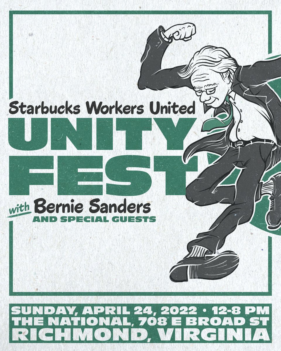 @SBWorkersUnited in Starbucks stores across the country has been a great inspiration to me. I am honored to be joining them for a rally in just a few weeks in Richmond, Virginia. I hope you'll join us. https://www.eventbrite.com/e/unity-fest-tickets-307813377097 …pic.twitter.com/iRkmiotw9U