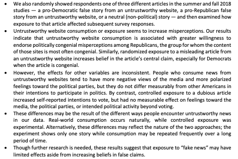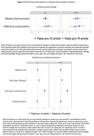 @andyguess, Lockett,@iBALyons,@Jacob_Montg,@JasonReifler: "Fake news" may have limited effects beyond increasing beliefs in false claims https://misinforeview.hks.harvard.edu/article/fake-news-limited-effects-on-political-participation/ … We find null effect of article exposure on media trust, affective polarization, etc https://twitter.com/ShorensteinCtr/status/1217125642061221888 …pic.twitter.com/H9gVsBGdmM