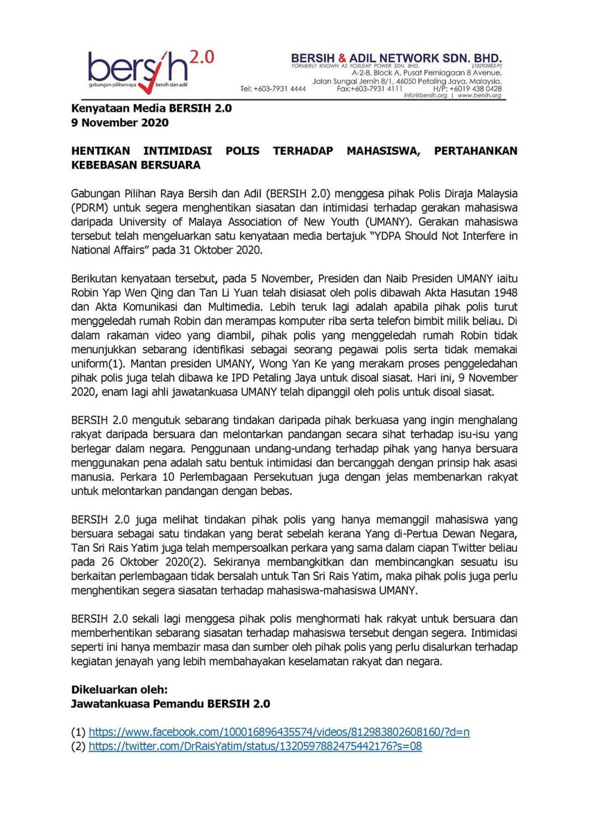 Kenyataan Media BERSIH 2.0 HENTIKAN INTIMIDASI POLIS TERHADAP MAHASISWA, PERTAHANKAN KEBEBASAN BERSUARA!pic.twitter.com/y1Fv4afcIJ