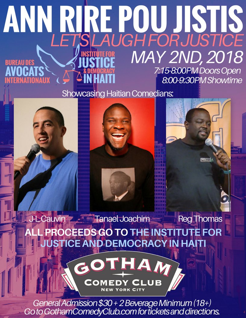 NEW YORK: get ready to giggle! Join @BAIhaiti and @ijdh @GothamComedy Club for a night of laughter and resistance with top comedic acts: J-L Calvin, Tanael Joachim and Reg Thomas on Wednesday, May 2nd. Not to be missed!https://twitter.com/ijdh/status/988855466959802369 …