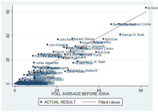 Scatter plot of Iowa polls vs Iowa results (data from https://fivethirtyeight.com/features/the-iowa-caucuses-are-in-4-days-almost-anything-could-still-happen/ …)pic.twitter.com/ZQ33rsp3ha