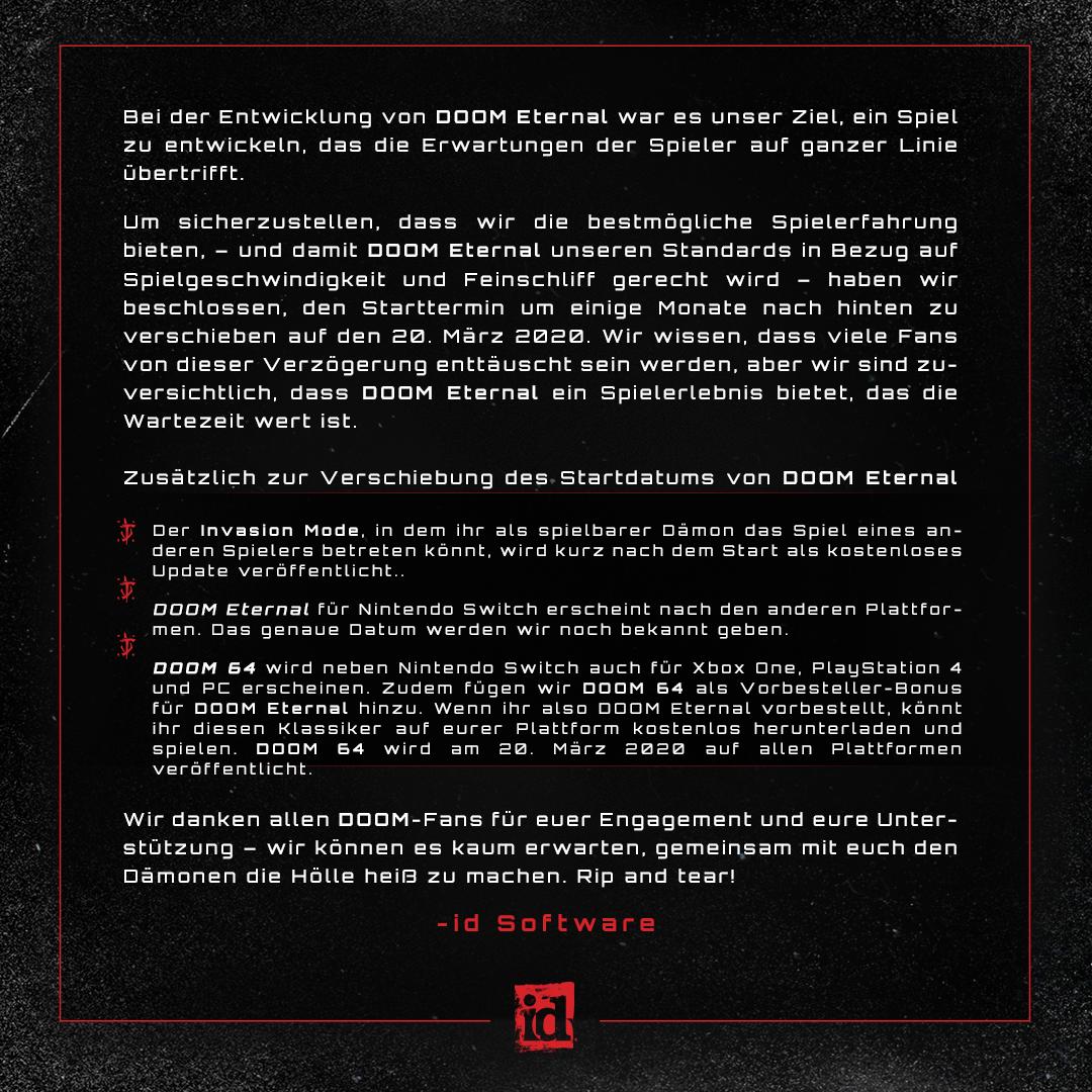 Die Verschiebung von DOOM Eternal ist nicht so schlimm, die Verschiebung von DOOM 64 hingegen tut weh. Frage: Wenn ich die Switch Version vorbestelle, werde ich dennoch am 20.März DOOM 64 spielen können?