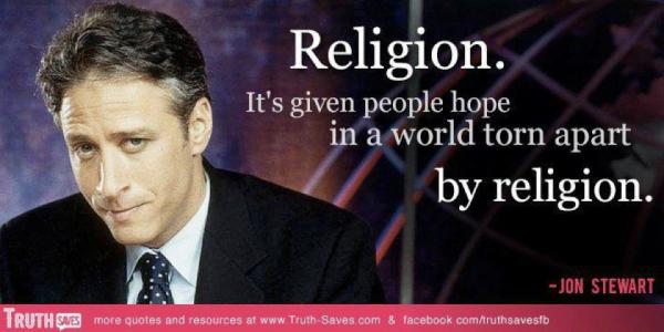"Religion. It's given people hope in a world torn apart...by religion." #JonStewart #TheDailyShowpic.twitter.com/RxP6yjsq
