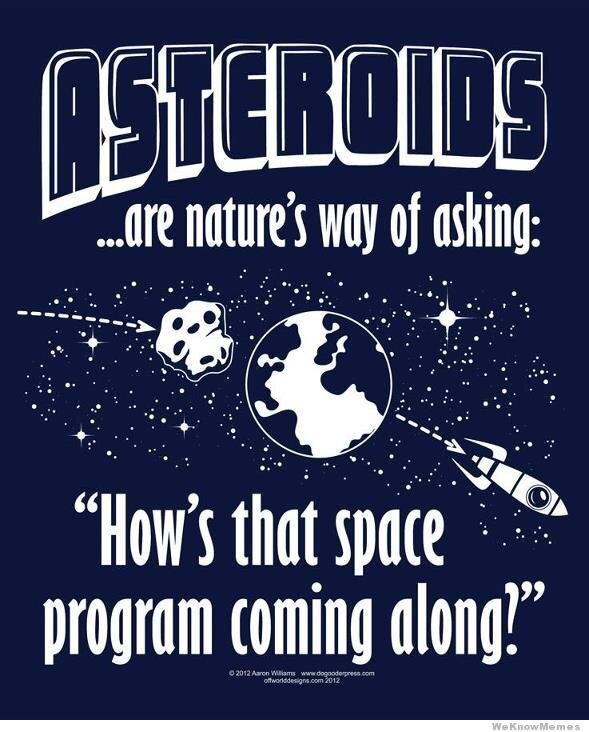 Never made more sense than today: Asteroids are nature's way of asking, "How's that space program coming along?"pic.twitter.com/I3nbqOl3