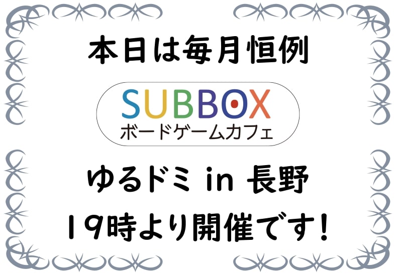 14時からオープンです。 今日は毎月恒例「ゆるドミ in 長野」の日、19時より開催です!色々な拡張入りでドミニオンを遊び尽くしましょう! 初めての方も経験者の方も、お1人様も大歓迎です! 皆様のご参加お待ちしています!pic.twitter.com/PVDVRqZb91