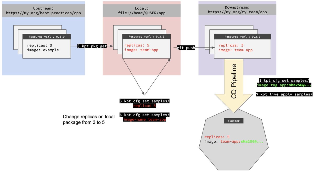 git is the most common source of truth for declarative configuration files, and users are increasingly driving deployment workflows from changes in git, either with traditional CI/CD tools or dedicated GitOps tools. kpt facilitates declarative workflows directly around git.