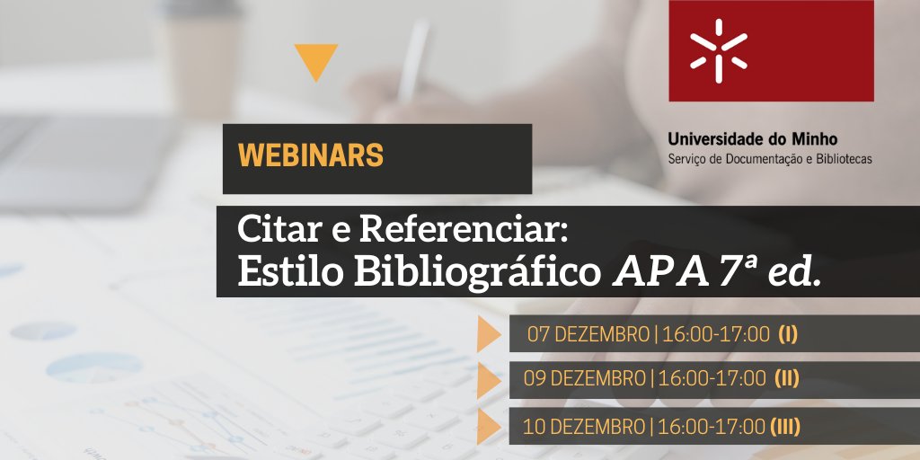 Nestes webinars serão apresentadas orientações como elaborar citações e referências bibliográficas, com base num estilo APA, este amplamente utilizado no mundo académico. 𝗜𝗡𝗦𝗖𝗥𝗜𝗖̧𝗢̃𝗘𝗦 𝗘𝗠: https://sdum.uminho.libcal.com/ +𝗜𝗡𝗙𝗢: formacao@usdb.uminho.pt Participe!pic.twitter.com/uKqcmu54ju