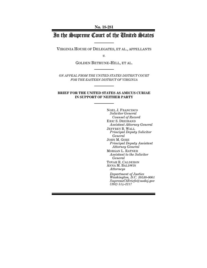 New in Virginia House of Delegates v. Bethune-Hill: Amicus brief of united states submitted. https://www.documentcloud.org/documents/5675704-Amicus-brief-of-united-states-submitted.html …pic.twitter.com/TSB9KKjsSg