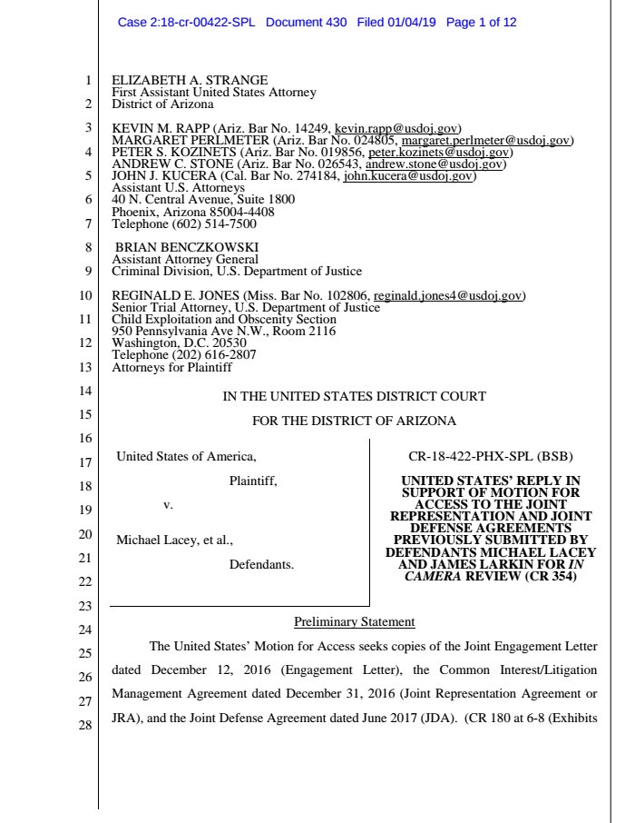 New filing in United States v. Michael Lacey (Backpage): Reply https://www.documentcloud.org/documents/5675680-Reply.html …pic.twitter.com/FPUiwRK5JH