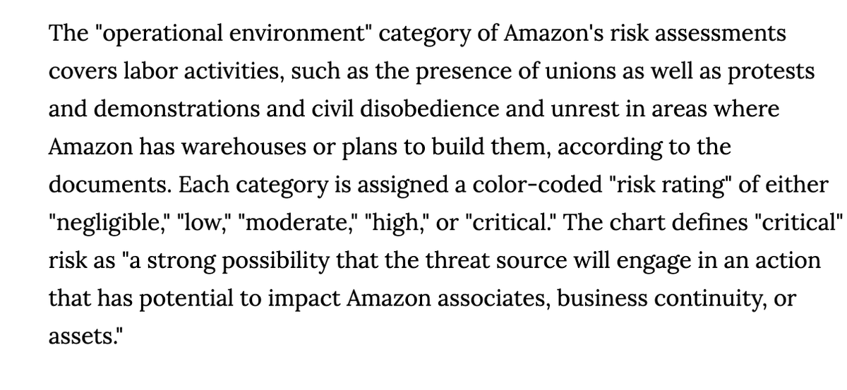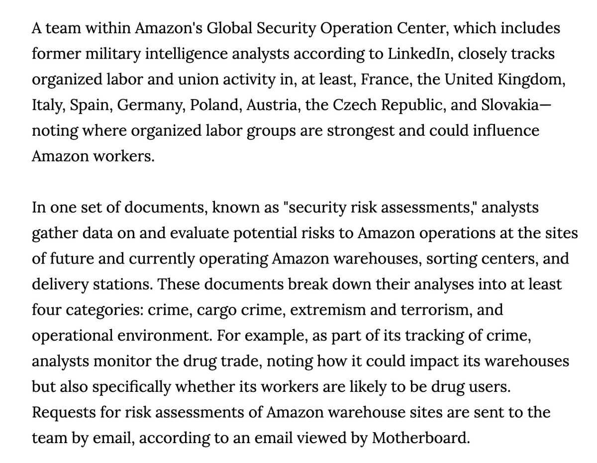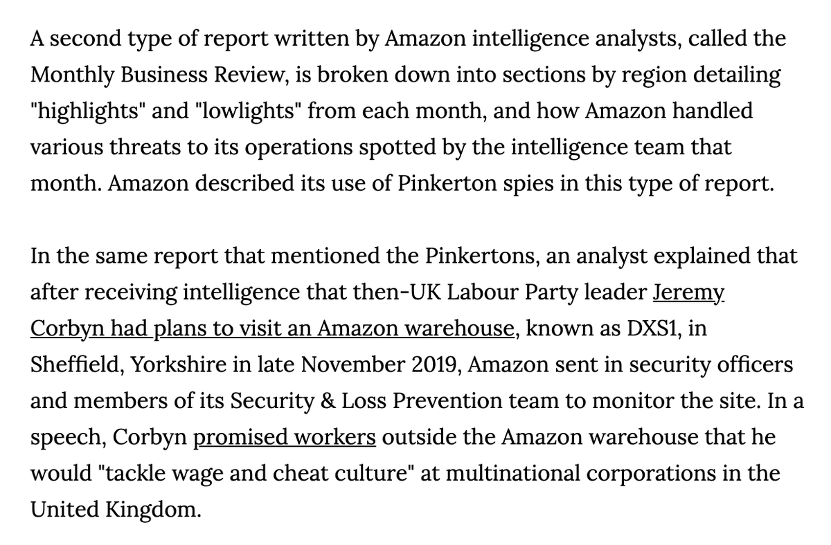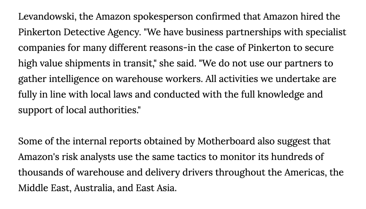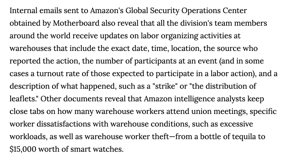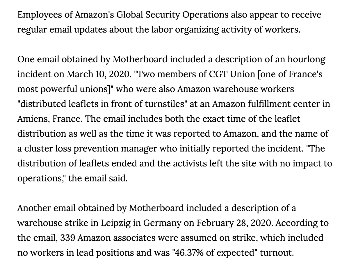 NEW: Dozens of docs leaked to @LaurenKGurley reveal a vast Amazon surveillance operation: 1) spying on workers w Pinkertons 2) surveilling labor unions 3) surveilling @Greenpeace & @GretaThunberg's group 4) surveilling France's gilets jaunes movementhttps://www.vice.com/en/article/5dp3yn/amazon-leaked-reports-expose-spying-warehouse-workers-labor-union-environmental-groups-social-movements …