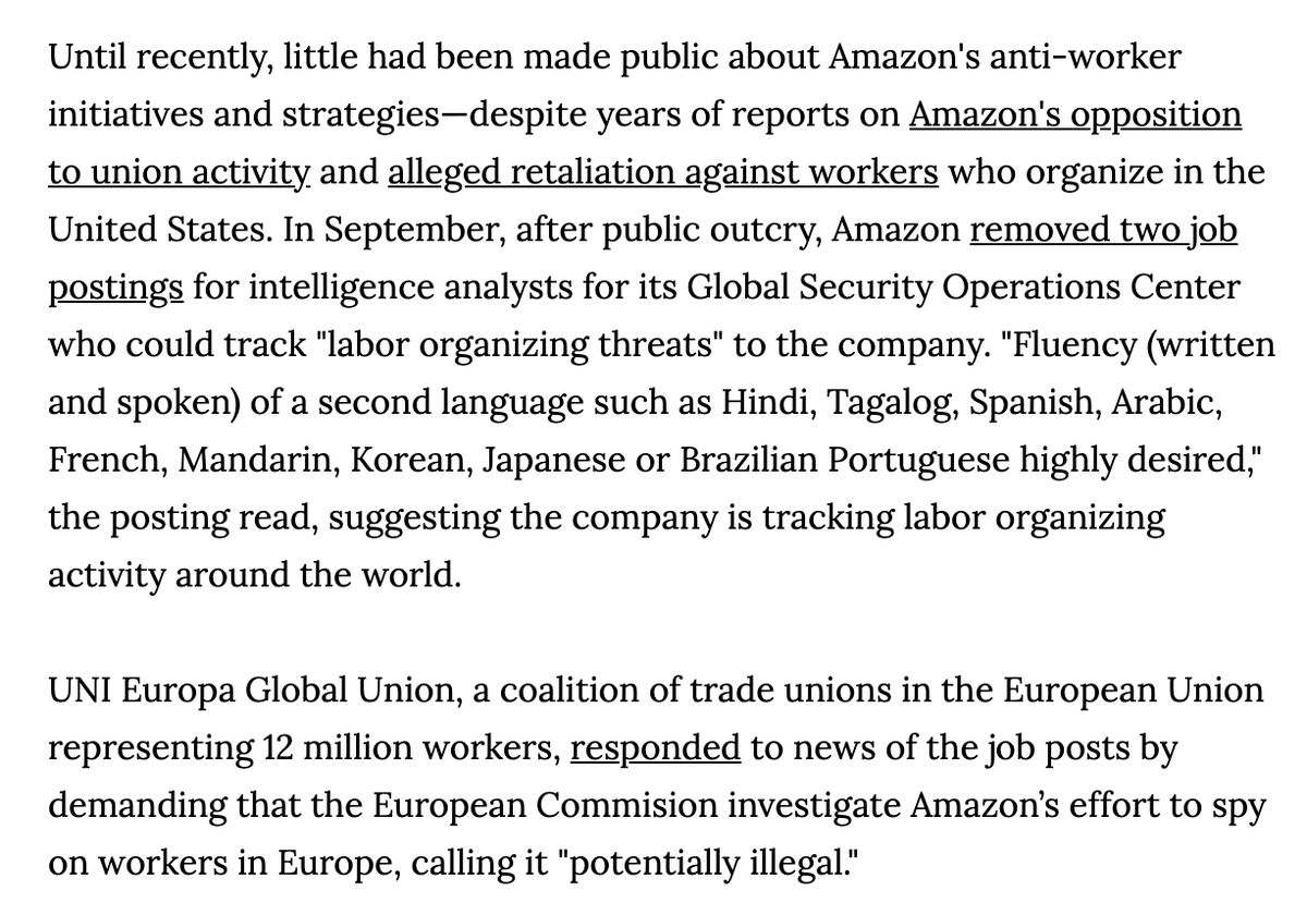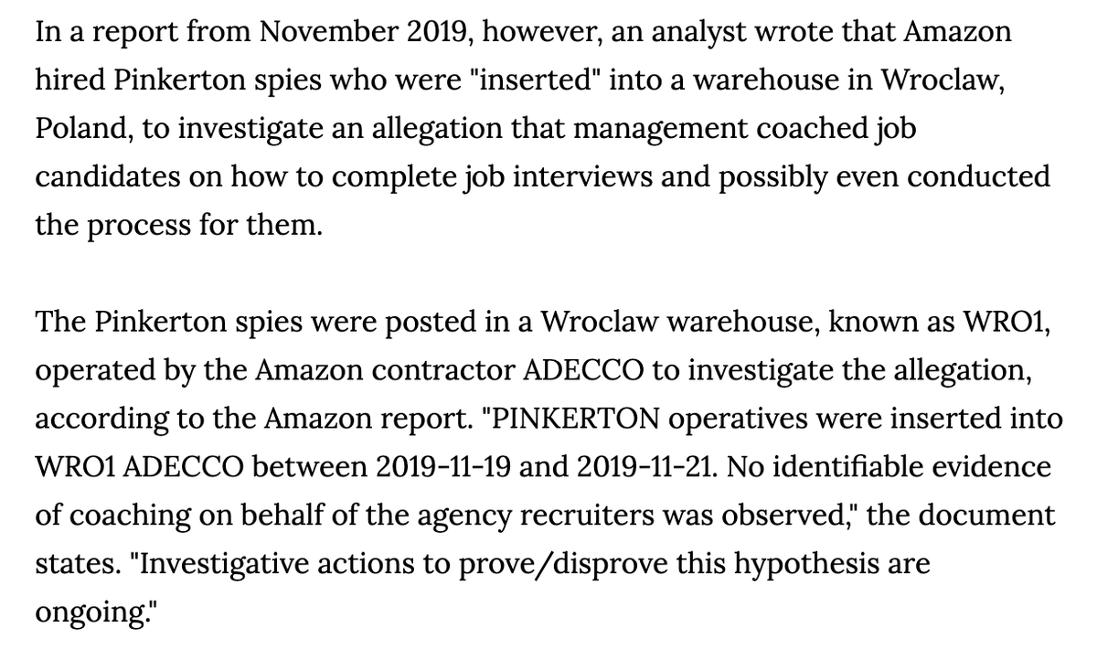 Amazon's Global Security Operations seems to surveil literally any environmental activism, labor organizing, or social movement in Europe. One notable instance: they hired Pinkertons to infilitrate a warehouse in Wroclaw, Poland and spy on workers and managers.pic.twitter.com/UzzCuYQ1BS