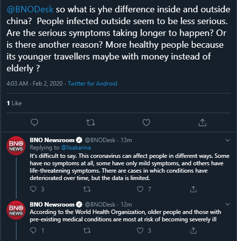 Difference betweem inside and outside china? People infected outside seem to be less serious. Are the serious symptoms taking longer to happen? Or is there another reason?