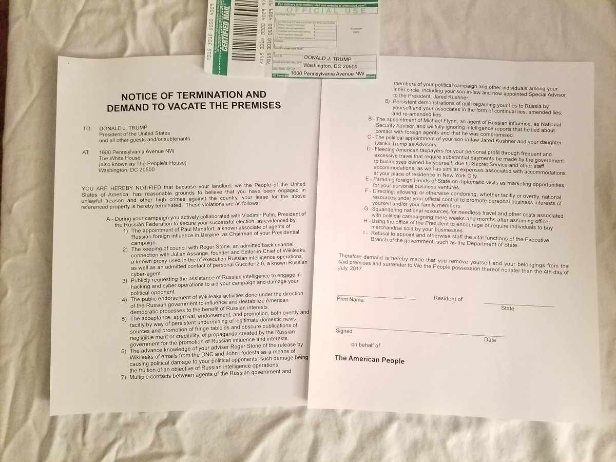 Hey POTUS, here's a certified letter for you. #evictPOTUSpic.twitter.com/a3Q4qEjTWP