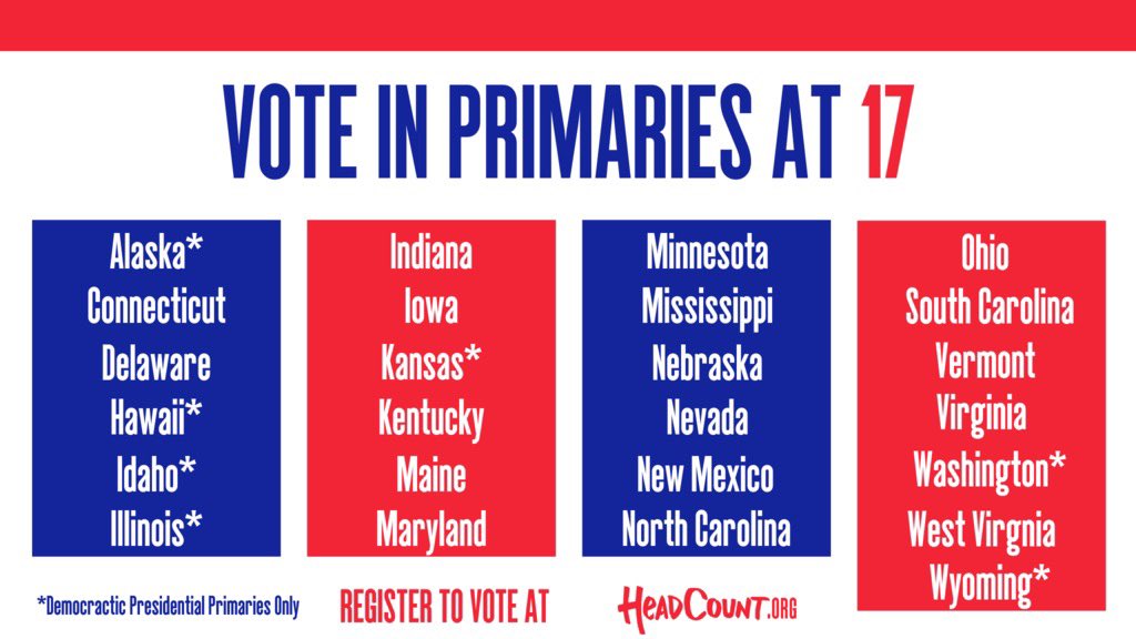 allow you to vote in the primaries at 17 if you’ll be 18 by the general election? Use your voice this election season, the first primaries are only a few days away! #TheFutureIsVotingpic.twitter.com/DbM8IyHRRr