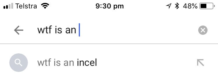 my slow male ageing brain could not comprehend fully the tweets on incel without having to Google ‘wtf is an incel’ but there are many acronyms in use today that I need to Google.pic.twitter.com/lROjxLkZBS