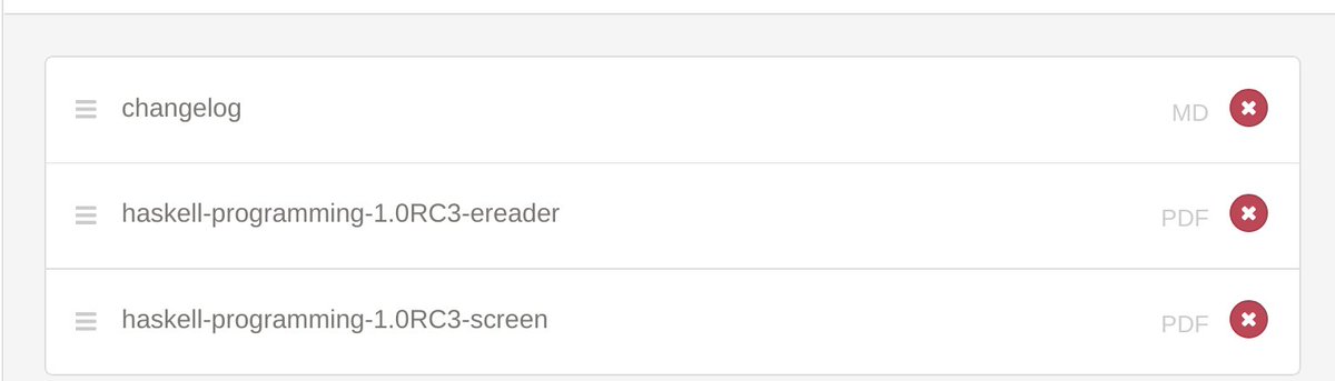 I have released the third release candidate of Haskell Programming from First Principles (http://haskellbook.com ) In addition to updating the screen and ereader PDF variants, I added a short entry in the changelog markdown file about what I fixed/changed. Hope you love it!pic.twitter.com/PycUFu5hRf