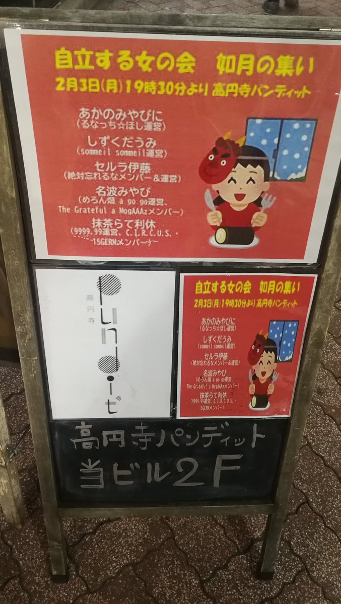 セル「2月3日来てください」 みやび「いえーい」 びに「高円寺パンディット」 らて「19時から」 びに「19時半まで!」