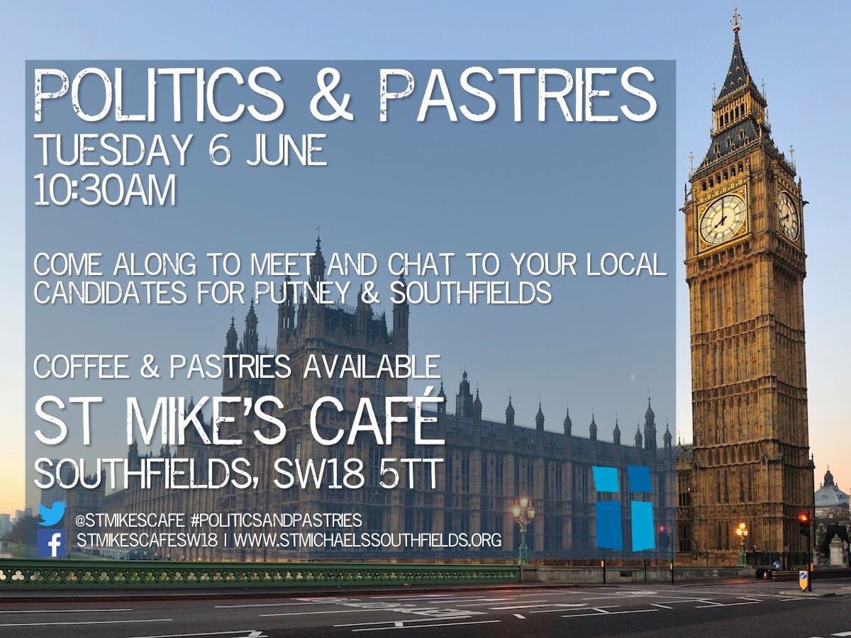 Really looking forward to meeting fellow #Southfields residents @StMikesCafe on Tuesday morning! Come & enjoy some #politicsandpastries :-)pic.twitter.com/zZoxBkxab5
