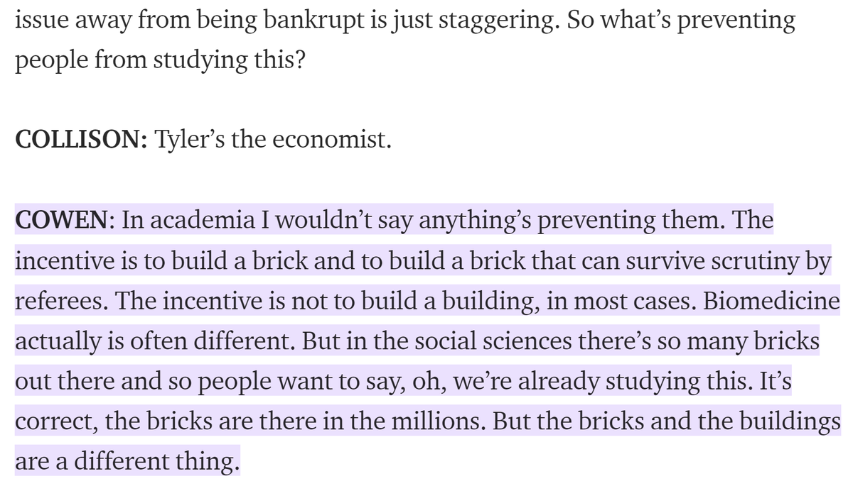 @tylercowen,@patrickc, and Mark Zuckerberg on progress studies. As we study the past and present and build the future, we need fewer bricks and more buildings. https://medium.com/conversations-with-tyler/mark-zuckerberg-interviews-patrick-collison-and-tyler-cowen-on-the-nature-and-causes-of-progress-30de2e2c48f2 …pic.twitter.com/wdu8WZdIqg