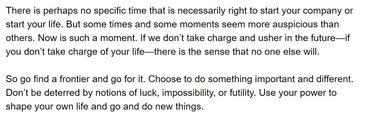 "Go find a frontier and go for it. Choose to do something important and different. Don’t be deterred by notions of luck, impossibility, or futility. Use your power to shape your own life and go and do new things." https://blakemasters.com/post/25149261055/peter-thiels-cs183-startup-class-19-notes …pic.twitter.com/Om5BXZkG5n