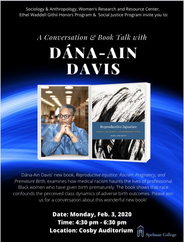 For people in the Atlanta area, this event about Dana-Ain Davis' new book, Reproductive Injustice: Racism, Pregnancy, and Premature Birth, is free and open to the public at Spelman College!https://twitter.com/SpelSocAnthro/status/1221829189596274688 …