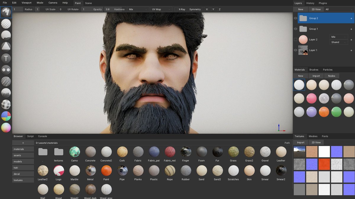 New ArmorPaint 0.8 dev builds! Working on asset browser with material previews, layer grouping, script console, faster ray-tracing, painting transparent surfaces.pic.twitter.com/cGeULAZ6eQ