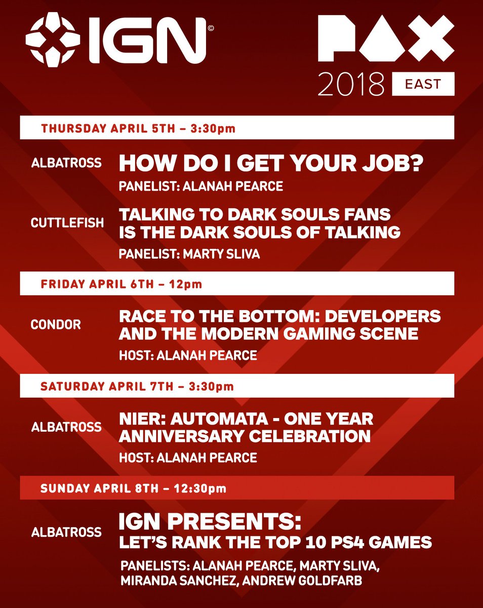 ALL the PAX panels :D! Details: http://www.ign.com/articles/2018/04/04/heres-how-you-can-meet-ign-at-pax-east-2018 …pic.twitter.com/Jcp3G4229K